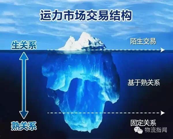 现在,再回头看看今天的主题:车货匹配平台解决的是哪一部分的事?很显然,现在的这些纷纷攘攘以“互联网思维”为基础的APP,都是在试图解决陌生匹配问题,这对于整体的运力供应市场来说,比例很小——正如冰山的水上部分,并且越来越小。