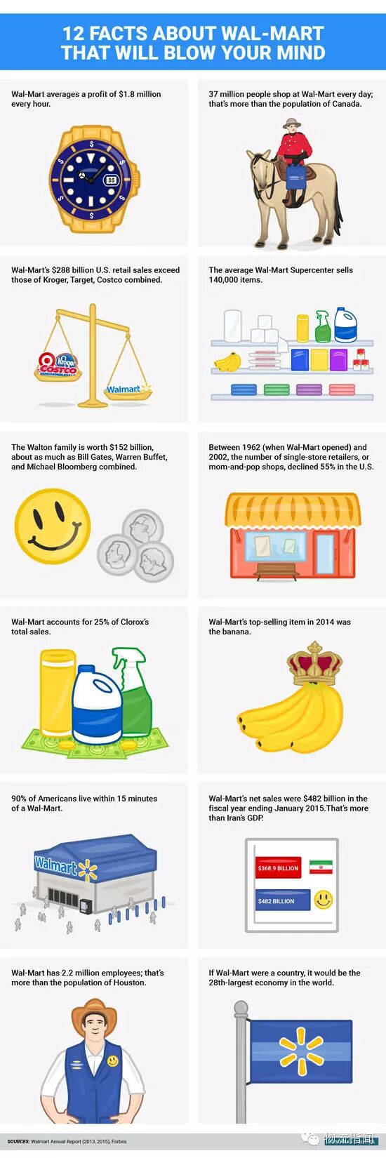 10.在2015年1月之前的上一个财年,沃尔玛的净销售额为4820亿美元,这比伊朗的GDP还要高。