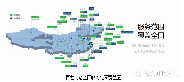 截至2015年10月,百世云仓历时5年,为国内外200多家品牌企业提供仓配一体化服务,在全国30个重点省份城市已有超过85个百世云仓服务网络,服务面积超过100万平方米,2015年服务范围扩展到北美及欧洲,即将开通日韩及澳新市场。